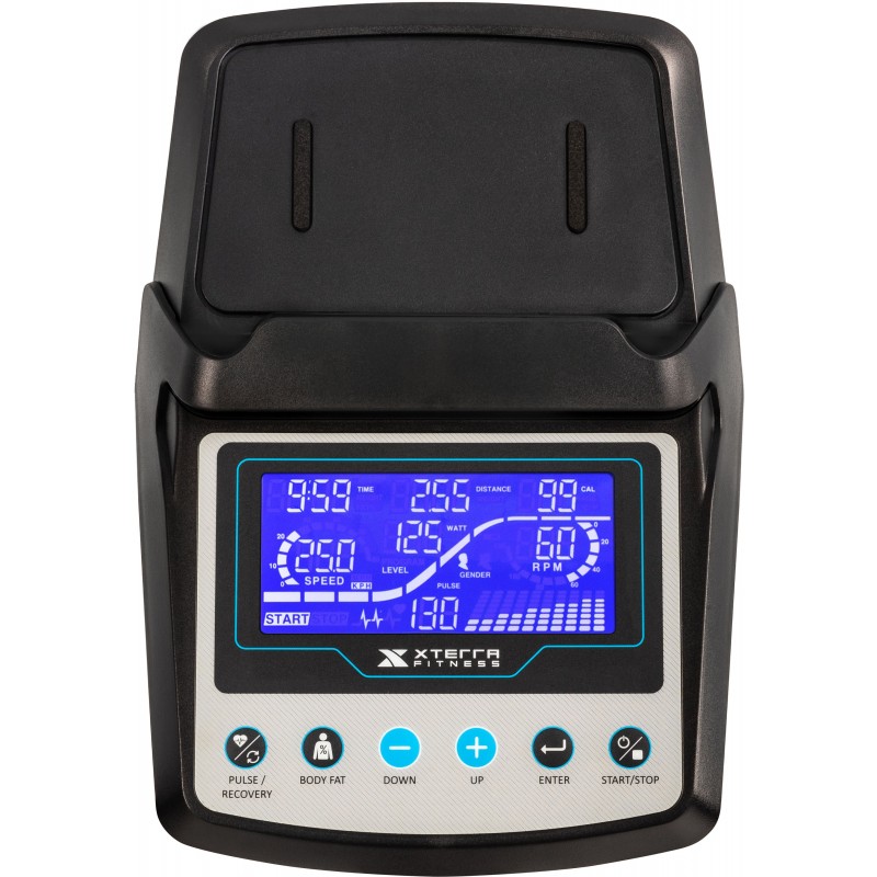 Το καθιστό ποδήλατο R15 από την XTERRA διαθέτει λαβές με επενδύσεις μαλακών υλικών για άνετο και γερό κράτημα. Οι γωνίες στις λαβές προσφέρουν διαφορετικά κρατήματα για περισσότερη άνεση και εναλλαγή θέσεων. Η κονσόλα του είναι αρκετά κομψή και πλήρως λειτουργική. Διαθέτει οθόνης τεχνολογίας LCD, όπου μπορείτε να δείτε σε αυτή όλες τις χρήσιμες πληροφορίες για την προπόνηση σας Χρόνος, Ταχύτητα, Απόσταση, Θερμίδες, Καρδιακοί Παλμοί, Περιστροφές/λεπτό, Ποσοστό λίπους, Επαναφορά. Επάνω από την οθόνη θα βρείτε μια θέση για το τάμπλετ σας για να απολαμβάνετε την αγαπημένη σας σειρά όσο κάνετε άσκηση.