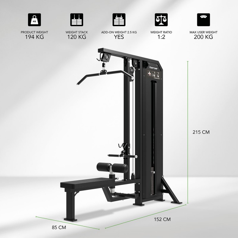 Το μηχάνημα εκγύμνασης Tunturi Platinum Dual Lat Pull Down Low Row Τροχαλία Πλάτης και Καθιστή Κωπηλατική συνδυάζει δύο ζωτικής σημασίας ασκήσεις για την πλάτη σε ένα πανίσχυρο μηχάνημα. Με εργονομικό και ομαλό τράβηγμα, στοίβα βάρους 120 κιλών και ρυθμιζόμενο ρόλερ ποδιών, παρέχει μια ολοκληρωμένη εξάσκηση πλάτης. Ο ανθεκτικός ατσάλινος σκελετός πάχους 2,5 mm και ο ακριβής έλεγχος της αντίστασης το καθιστούν ιδανικό για γυμναστήρια και αφοσιωμένους γυμναστές δύναμης.
