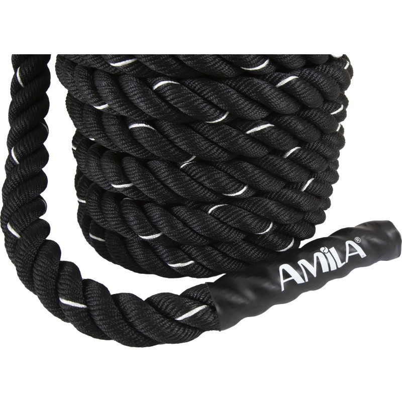 Το AMILA Battle Rope NS είναι κατασκευασμένο από πολυεστέρα με πάχος ίνας 2mm. Η λαβή 38χιλιοστών κατασκευασμένη από PE με αντιολισθητική επιφάνεια, θα προσφέρει πολύ δυνατό και άνετο πιάσιμο καθώς και ιδιαίτερα υψηλή αντοχή.