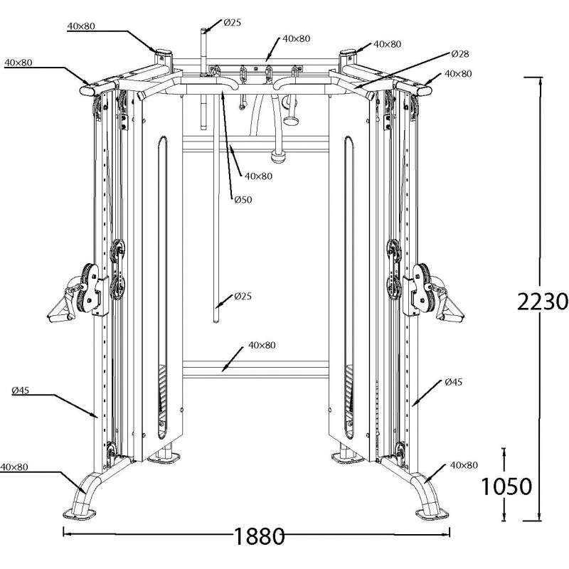 Βάρος (kg)234Διαστάσεις (cm)105x188x223Σύνολο Βαρών (kg)160ΣυρματόσχοιναΑεροπορικού τύπου αντοχής 2000lbsΚαλύμματα ΒαρώνΝαιΣωλήνεςΒαρέως τύπου 40x80x2.0mmΠεριλαμβάνειΜακριά μπάρα, Κοντή μπάρα, Σχοινί τρικεφάλων, Λαβή έλξεων, 3 αλυσίδες, Μονές χειρολαβές, Μαλακές χειΧώρα ΠροέλευσηςΚΙΝΑ-