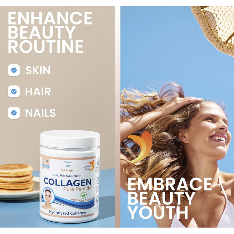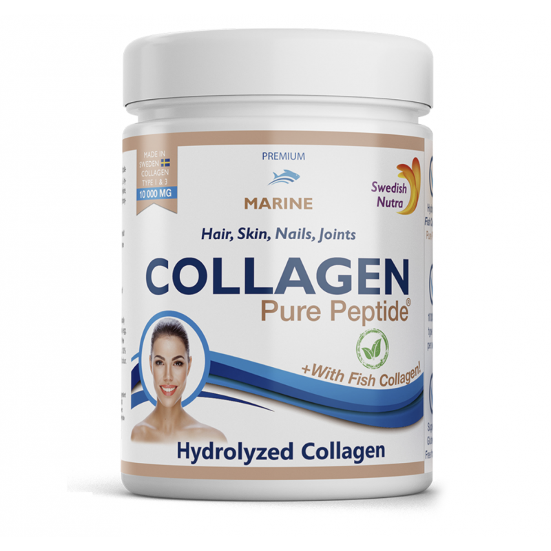 Το Collagen Pure Peptide είναι στην ουσία φυσική πρωτεϊνη (κολλαγόνο) σε ενώσεις πεπτιδίων για καλύτερη απορρόφηση. Το πόσιμο κολλαγόνο συμβάλει στην διατήρηση σφριγηλής και νεανικής επιδερμίδας, στην υγεία των αρθρώσεων, στην ενδυνάμωση μυών, συνδέσμων και μαλλιών αλλά και στον μεταβολισμό του λίπους. Παράγεται εξ ολοκλήρου σε πρότυπες εγκαταστάσεις στη Σουηδία υπό αυστηρότατα στάνταρ ασφάλειας και ποιότητας που εγγυώνται την αποτελεσματικότητα του. Περιέχει 10.000mg καθαρό κολλαγόνο στη δόση, από ωκεάνιες πηγές. Μειώνει τις λεπτές γραμμές και τις ρυτίδες ενώ βελτιώνει την ελαστικότητα του δέρματος. Το κολλαγόνο που προέρχεται από τα ψάρια έχει μεγαλύτερη βιοδιαθεσιμότητα από όλα τα άλλα είδη κολλαγόνου. Αυτό σημαίνει ότι απορροφάται πολύ καλύτερα από τον οργανισμό σε σχέση με άλλους τύπους κολλαγόνου. Περιέχει κολλαγόνο τύπου 1 και 3 που ωφελούν ιδιαίτερα την ανθρώπινη επιδερμίδα Περιέχει 100% καθαρό κολλαγόνο σε σκόνη χωρίς ζάχαρη, γλουτένη, γλυκαντικά ή συντηρητικά. Έρχεται σε συσκευασία των 300 γραμμαρίων χωρίς γεύση. Συστατικά: Υδρολυμένο κολλαγόνο τύπου 1 και 3. Περιέχει τα αμινοξέα : L-γλυκίνη, L-προλίνη, L-αλανίνη, L-υδροξυπρολίνη, L-γλουταμινικό οξύ, L-αργινίνη, L-ασπαρτικό οξύ, L-σερίνη , L-λυσίνη, L-λευκίνη, L-βαλίνη, L-θρεονίνη, L-φαινυλαλανίνη, L-ισολευκίνη, L-υδροξυλυσίνη, L-μεθειονίνη, L-ιστιδίνη, L-τυροσίνη, L-κυστεΐνη). * Μη γενετικά τροποποιημένο τρόφιμο, χωρίς σιτάρι, γλουτένη, σόγια, αυγά, ξηρούς καρπούς και γάλα.