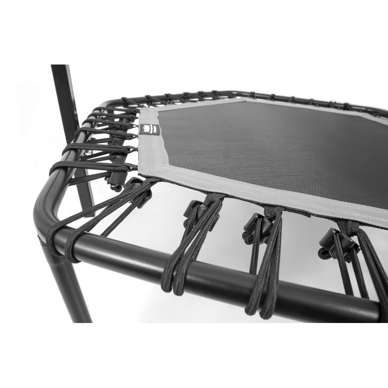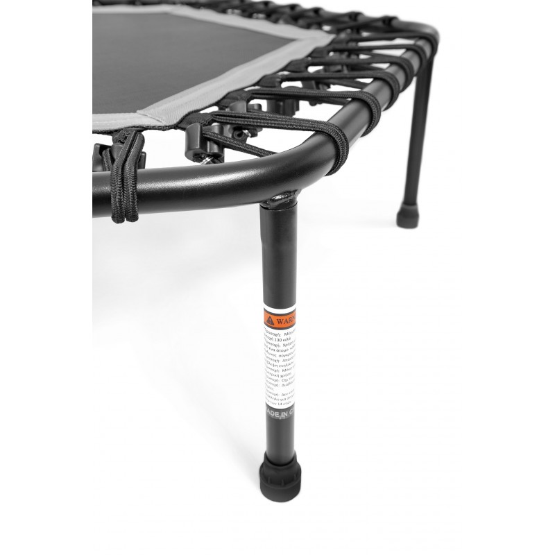 Το μέγεθος του είναι ιδανικό για επαγγελματική χρήση, σε προγράμματα group στο γυμναστήριο ή ακόμα και για οικιακή χρήση. Με διάμετρο 112 εκατοστά, και ύψος 29 εκατοστά, καταλαμβάνει έναν χώρο λίγο παραπάνω από 2 καρέκλες. Αυτό το καθιστά ιδανικό για να το τοποθετήσετε ακόμα και σε μικρό χώρο. Η αναπήδηση που προσφέρει είναι εξαιρετική και αυτό χάρις τα 36 λάστιχα (και όχι ελατήρια) που διαθέτει, κάνοντας το τραμπολίνο παράλληλα αθόρυβο. Έρχεται με ένα ελκυστικό συνδυασμό χρωμάτων, μαύρου σκελετού με γκρι λεπτομέρειες.