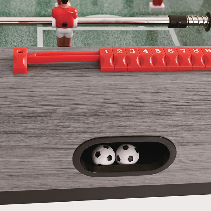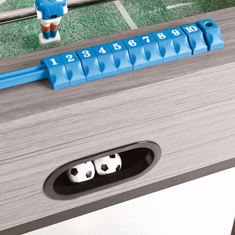 - Χαρακτηριστικά: Πεδίο παιχνιδιού MDF με επικάλυψη από πράσινο εφέ χρώματος που μοιάζει με χορτάρι. Ανθεκτικό πόδια MDF. Άμεση ανάκτηση της μπάλας πίσω από τα τέρματα. Καμπίνα από μελαμίνη σε γκρι χρώμα. ,